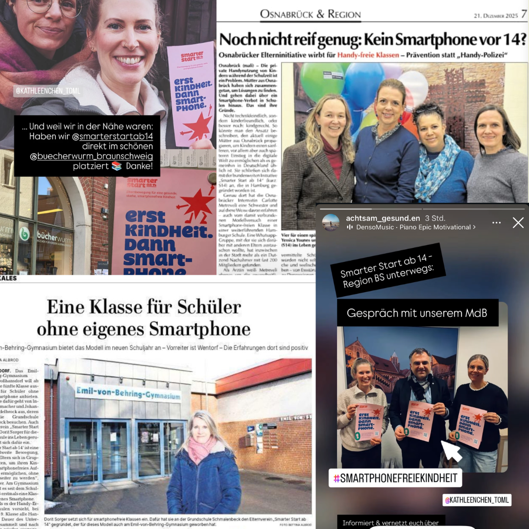 Guckt nach England! Am 3. Februar hat Daisy Greenwell auf Instagram einen Post abgesetzt, der viral ging. Sie schrieb: „Lasst uns die soziale Norm verändern und es zu einer seltsamen Entscheidung machen, seinem Kind ein Smartphone zu geben!“ So entstand „Smartphonefree Childhood“. In der WhatsApp Gruppe der Bewegung waren innerhalb von 24 Stunden Tausende anderer Eltern beigetreten, die nun ihrerseits regionale WhatsApp Gruppen für ihre Schulen einrichteten. Unglaubliche 10.000 Eltern haben sich der Bewegung in den letzten 3 Wochen angeschlossen und sich für eine Smartphonefreie Kindheit bis mindestens 14 entschieden. https://smartphonefreechildhood.co.uk/about-